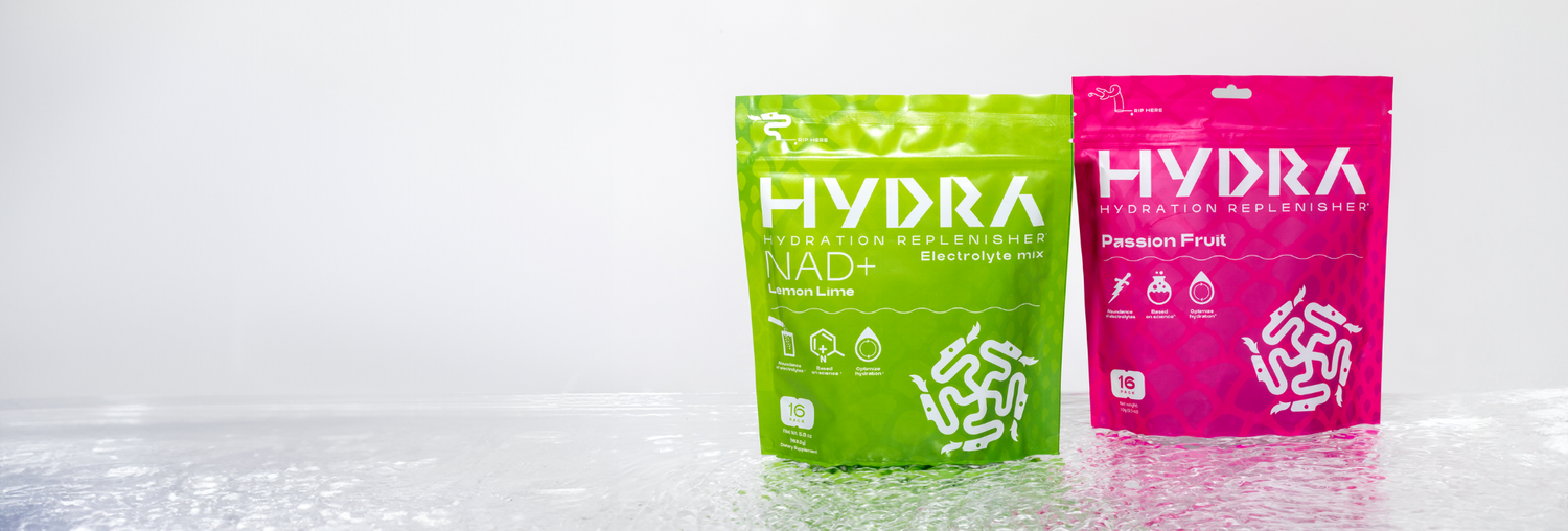 Shop our Passionfruit Electrolyte Powder and Lemon Lime Hydra Electrolyte Powder with NAD+. Also available to purchase on Amazon.